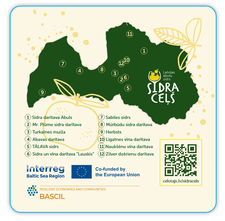 Projekta BASCIL ietvaros esam sagatavojuši jaunus Latvijas Sidra ceļa mārketinga materiālus – glāžu palikņus–informatīvās kartes, kas aicina iepazīt īstā ābolu sidra ražotājus Latvijā un doties ceļā pa sidra darītavām.