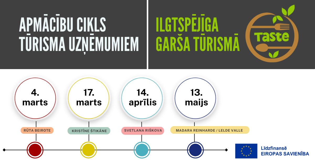Latvijas lauku tūrisma asociācija Lauku ceļotājs aicina tūrisma uzņēmumus piedalīties apmācību ciklā “Ilgtspējīga garša tūrismā” – četras klātienes apmācības, kas notiks no š.g. marta līdz maijam. Apmācību cikls aptver tēmas no augu risinājumiem mūsdienīgā virtuvē un gudras resursu izmantošanas līdz autentiskai tūrisma pieredzei un tās komunikācijai ar klientu.