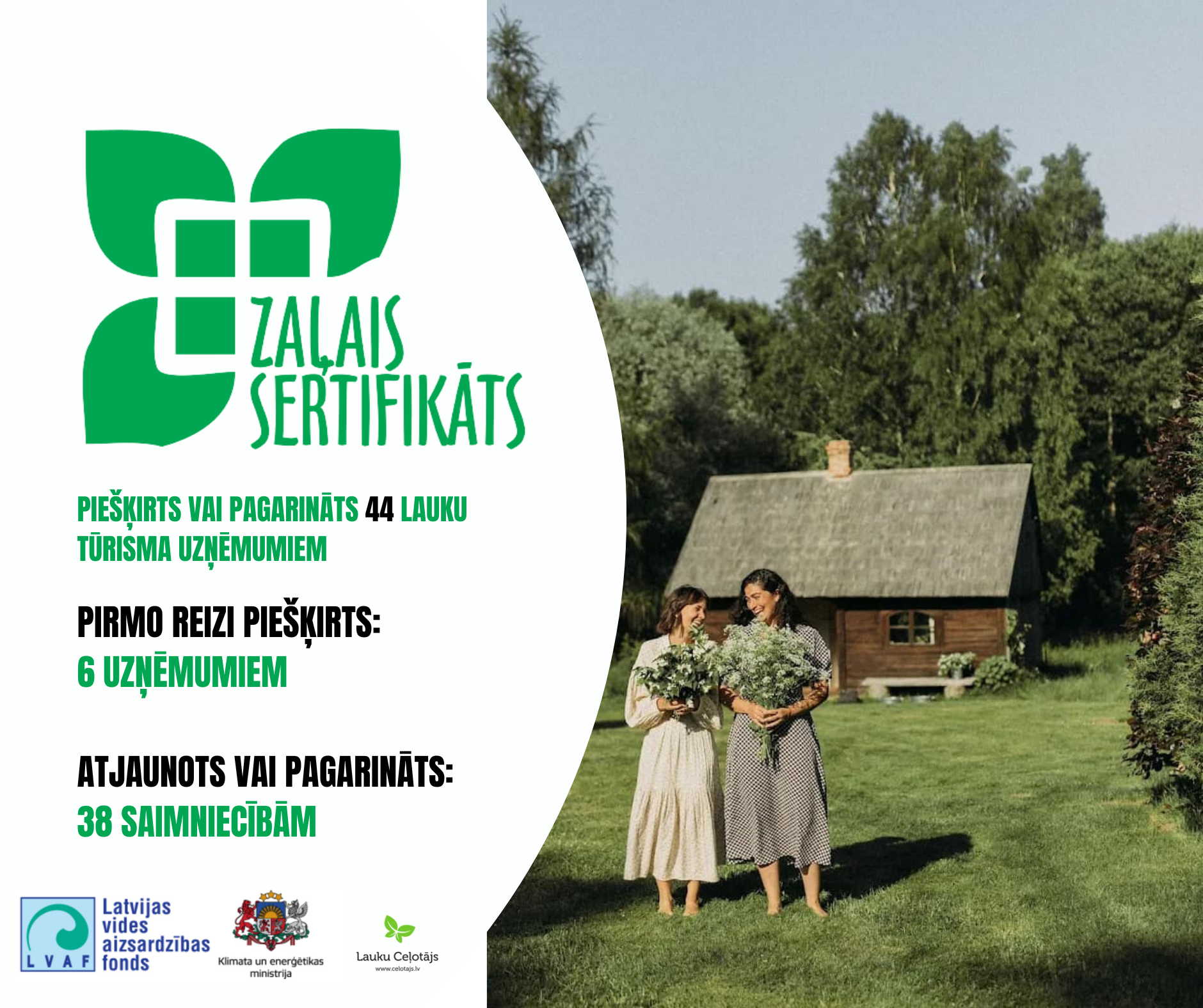 “Zaļais sertifikāts” ir vides kvalitātes zīme tūrisma uzņēmumiem laukos - naktsmītnēm, ēdināšanas vietām un ražojošām saimniecībām, kas uzņem apmeklētājus. 114 zaļi domājoši tūrisma uzņēmumi Latvijā saimnieko videi draudzīgi un piedāvā lielisku atpūtu saviem viesiem, kuriem svarīgas zaļās izvēles.